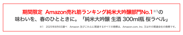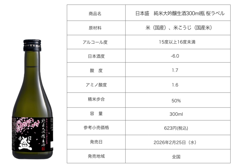 日本盛株式会社(本社:兵庫県西宮市、代表取締役社長:森本 太郎)は、春の季節限定商品としてAmazon売れ筋ランキング純米大吟醸部門でNo.1※1を獲得した純米大吟醸生酒から「純米大吟醸 生酒300ml 瓶 桜ラベル」を2026年2月25日(水)より期間限定で発売しております。本商品は、米のふくよかな味わいと、鮮度あふれるフルーティーな香りが楽しめる濃醇かつ芳醇な純米大吟醸生酒です。お花見や春の食卓など、季節のひとときを彩る一杯としてお楽しみいただけます。